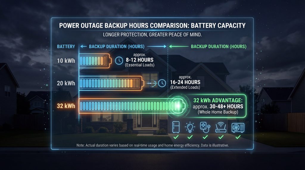 Key Takeaway: A 32 kWh system offers substantial autonomy for critical loads but requires management for whole-home sustained use.